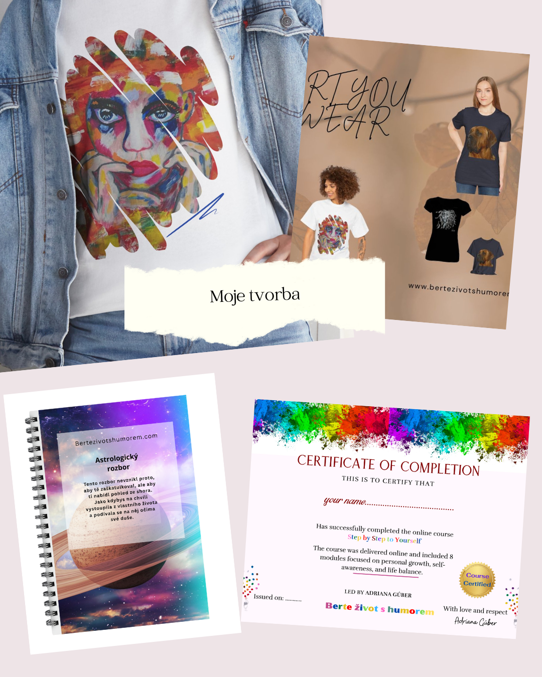 Moje tvorba spojuje osobní příběhy, humor a vizuální inspiraci. Videa, malby, návrhy triček, kniha a online kurz - všechno, co tvořím, má duši a má přinášet radost.